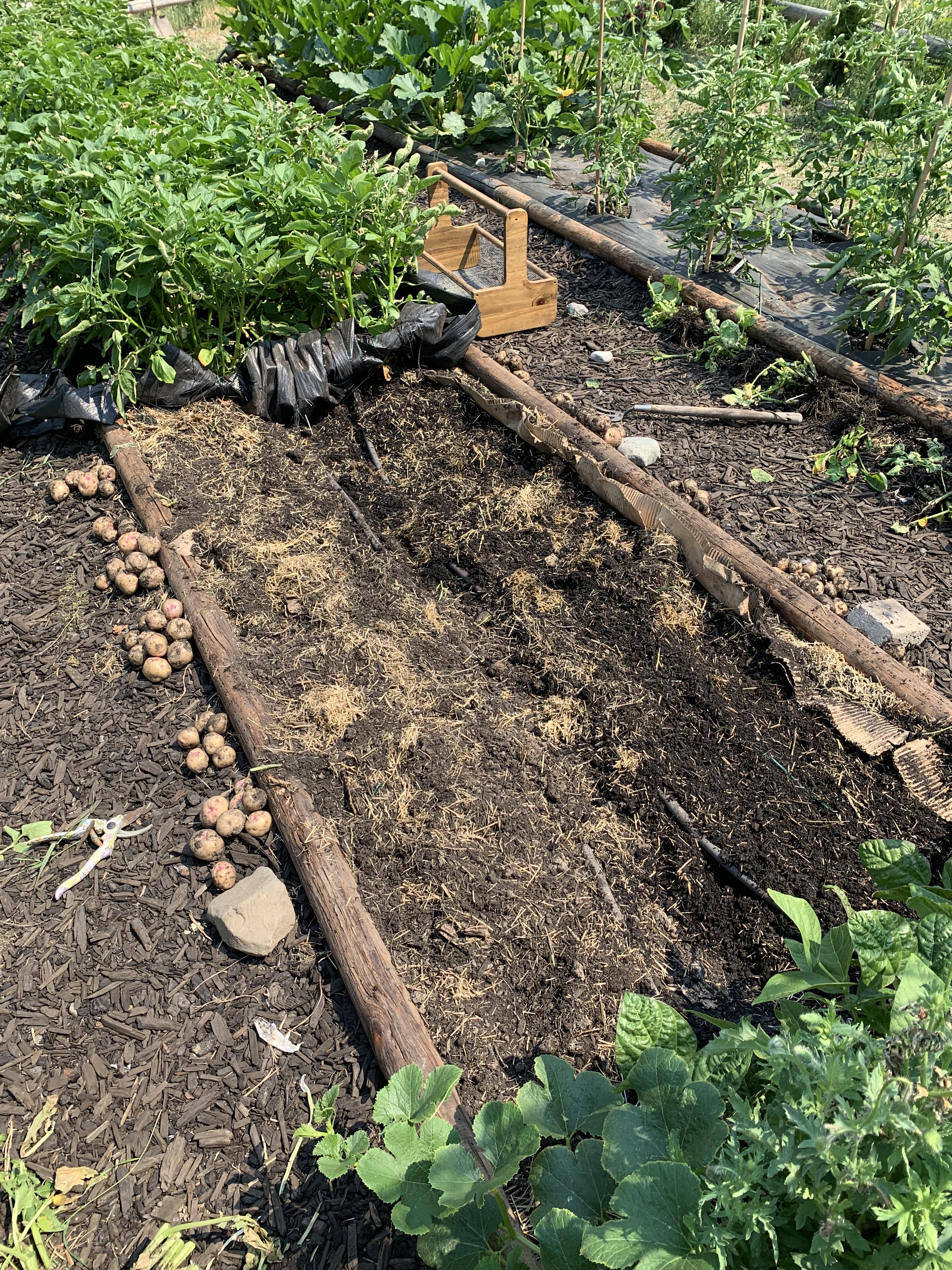 As an experiment I did do the potato row without cardboard and instead covered the top of the row with weed barrier fabric, I then cut large holes for where I planted the seed potatoes. It worked really well for suppressing the weed, though I did have a couple here and there where I had cut the holes. it also helped a lot with moisture retention in the soil. Having the fabric on top also was great at keeping the light off of any potatoes that were protruding through the soil and the earthworms loved it for the darkness and moisture too!